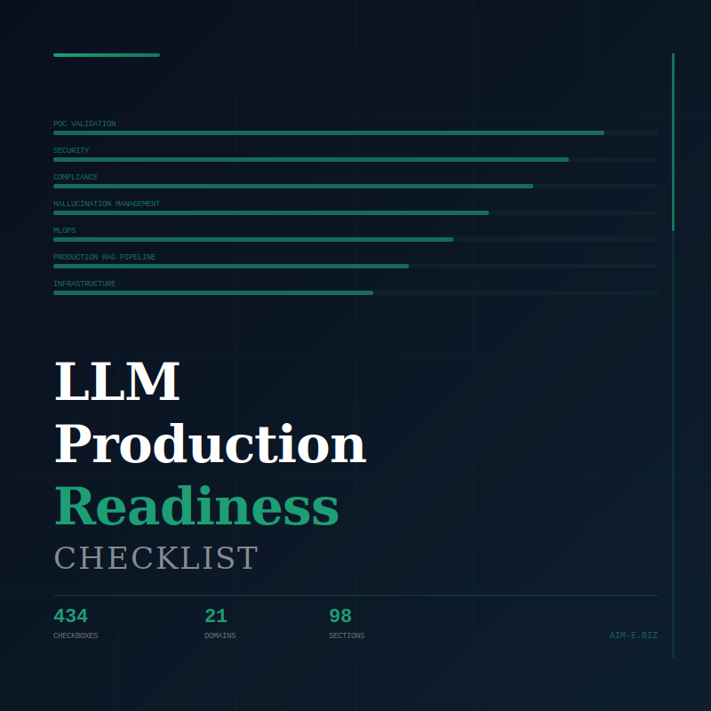 This checklist covers all of it. 434 checkboxes across 21 domains — POC validation, cost modelling, infrastructure, security, compliance, hallucination management, MLOps, prompt engineering, production RAG, and more. Built from OWASP LLM Top 10 (2025), OWASP Agentic Top 10 (2026), NIST AI RMF, MITRE ATLAS, EU AI Act, HIPAA, SOC 2, and 20+ additional sources verified through April 2026.